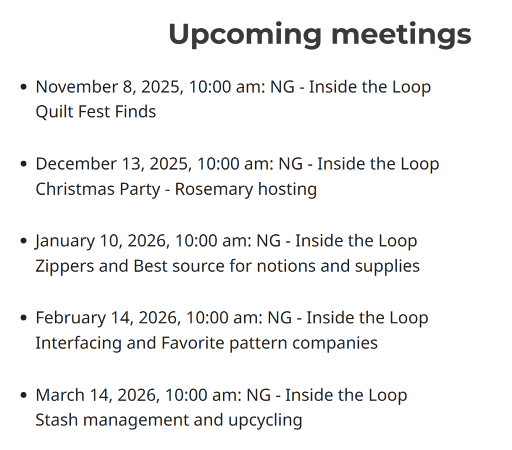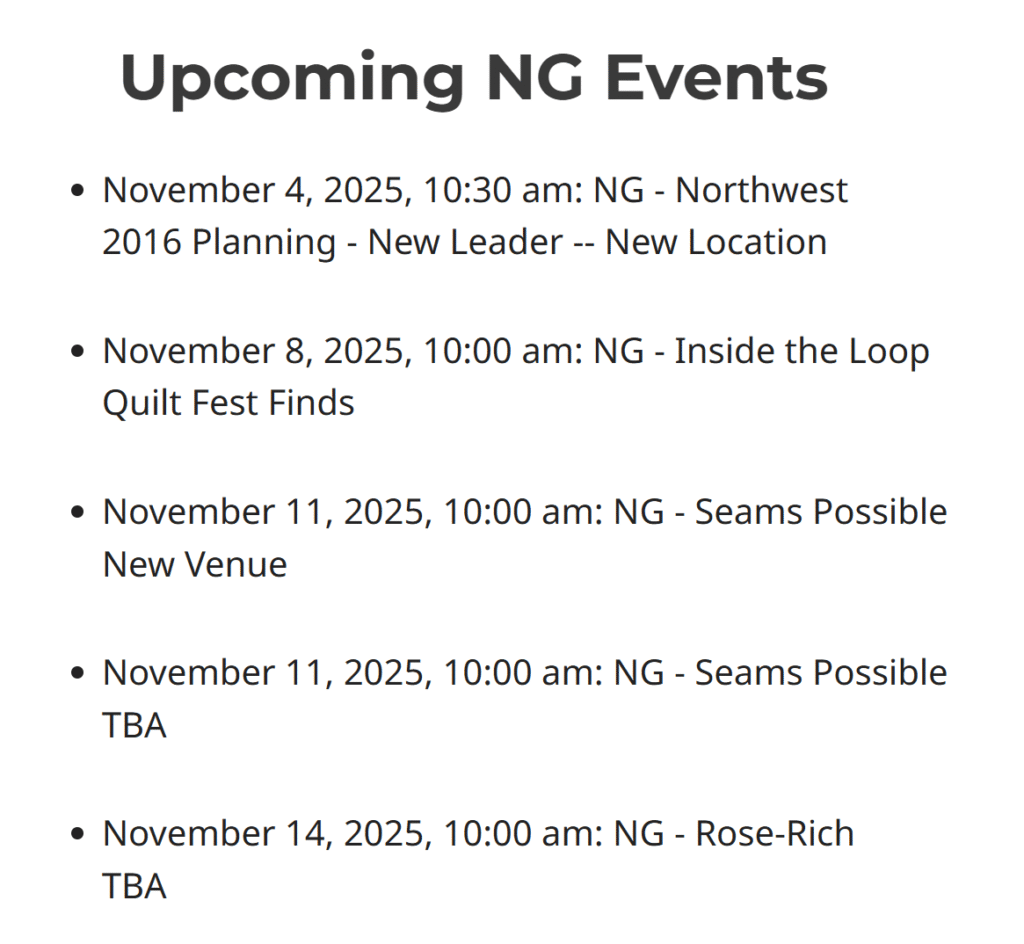 As an example, I have taken a screen shot of the Neighborhood Group Detail page. What is listed is the next five NG meetings. Program notes, when available, are displayed.